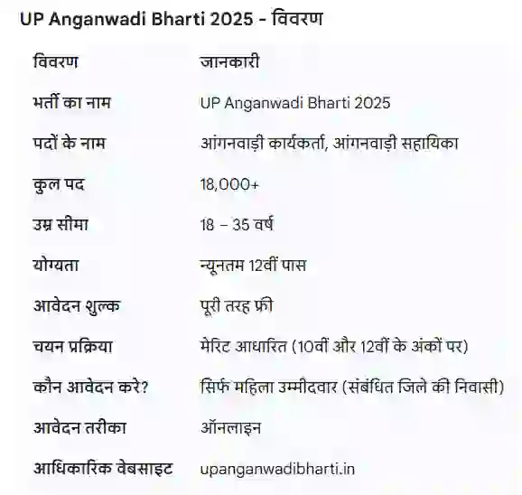 इस बार भर्ती जिला-वार की जा रही है, यानी हर जिले के लिए अलग-अलग आवेदन तिथियाँ निर्धारित की गई हैं।यह भर्ती उन महिलाओं के लिए सुनहरा अवसर है जो अपने जिले में रहते हुए सरकारी नौकरी, महिला रोजगार, Anganwadi Vacancy 2025, या UP Sarkari Naukri की तलाश कर रही हैं। योग्यता केवल 12वीं पास रखी गई है और आवेदन प्रक्रिया पूरी तरह फ्री है। इस भर्ती में कोई आवेदन शुल्क नहीं लिया जाता जिससे सभी वर्ग की महिलाएं आसानी से आवेदन कर सकती हैं।